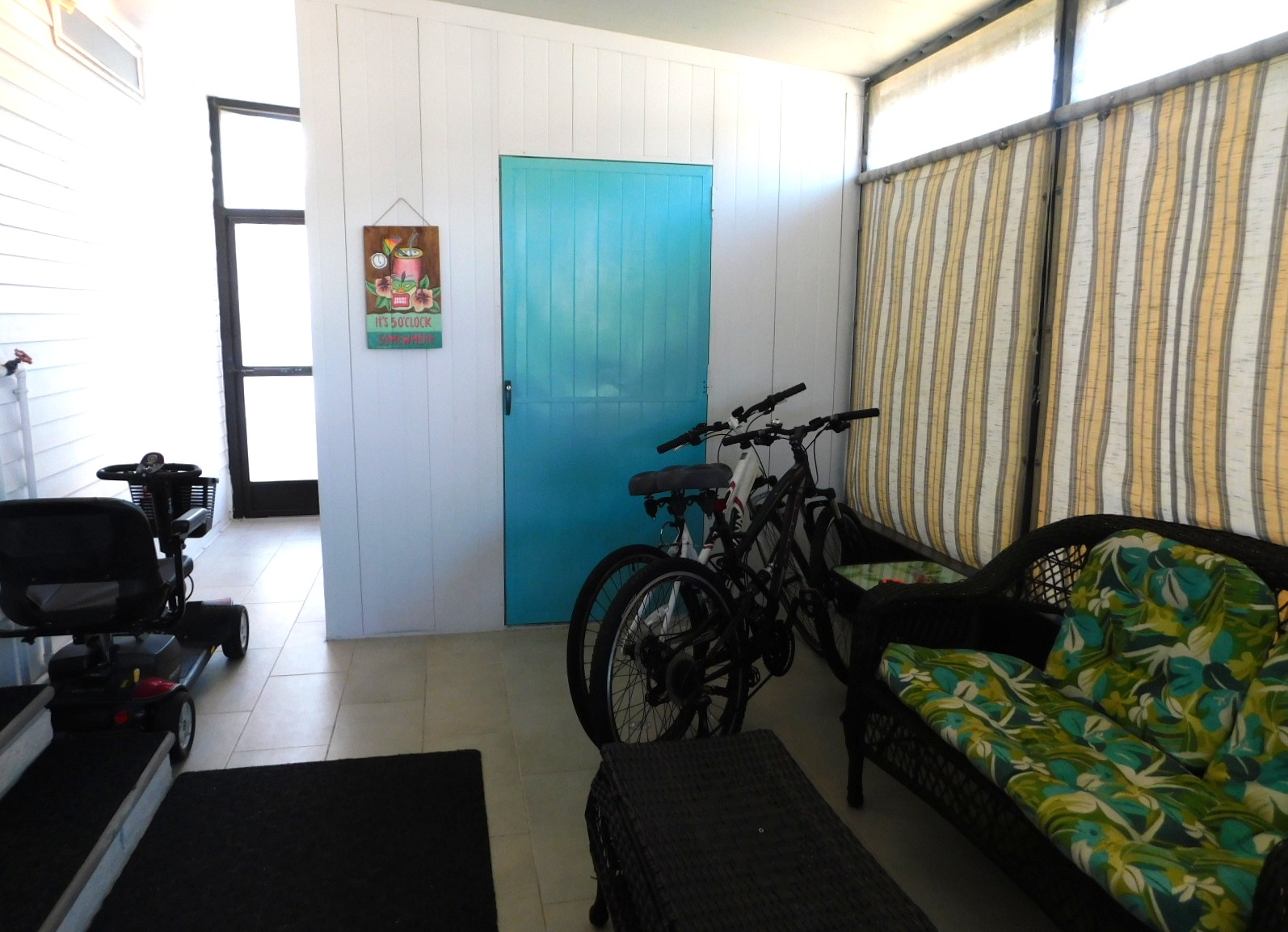 As you pull up to this home you will see the raised Lanai. There is an entrance into the home off the carport. This open screened in Lanai is perfect for sitting out in the morning drinking coffee and watching the world go by. It also has custom made roll-down canvas panels to block the weather and protect the space when you are not there.