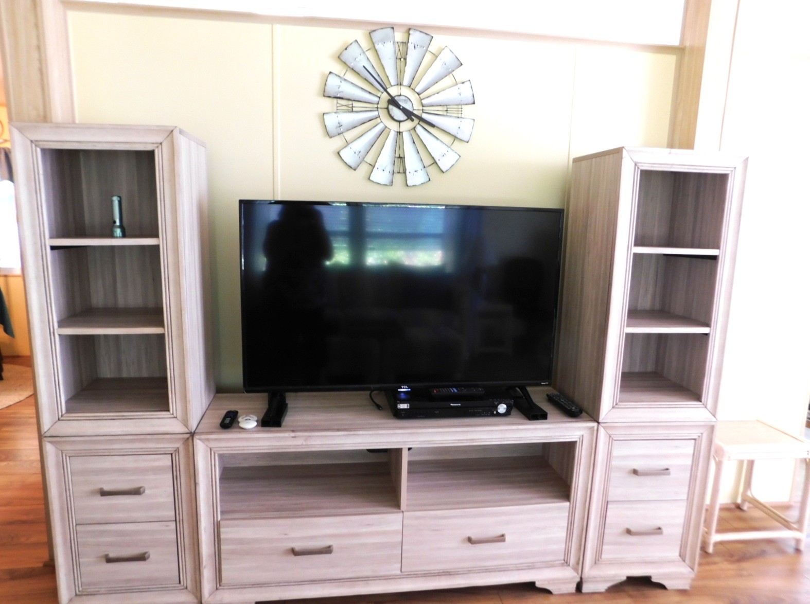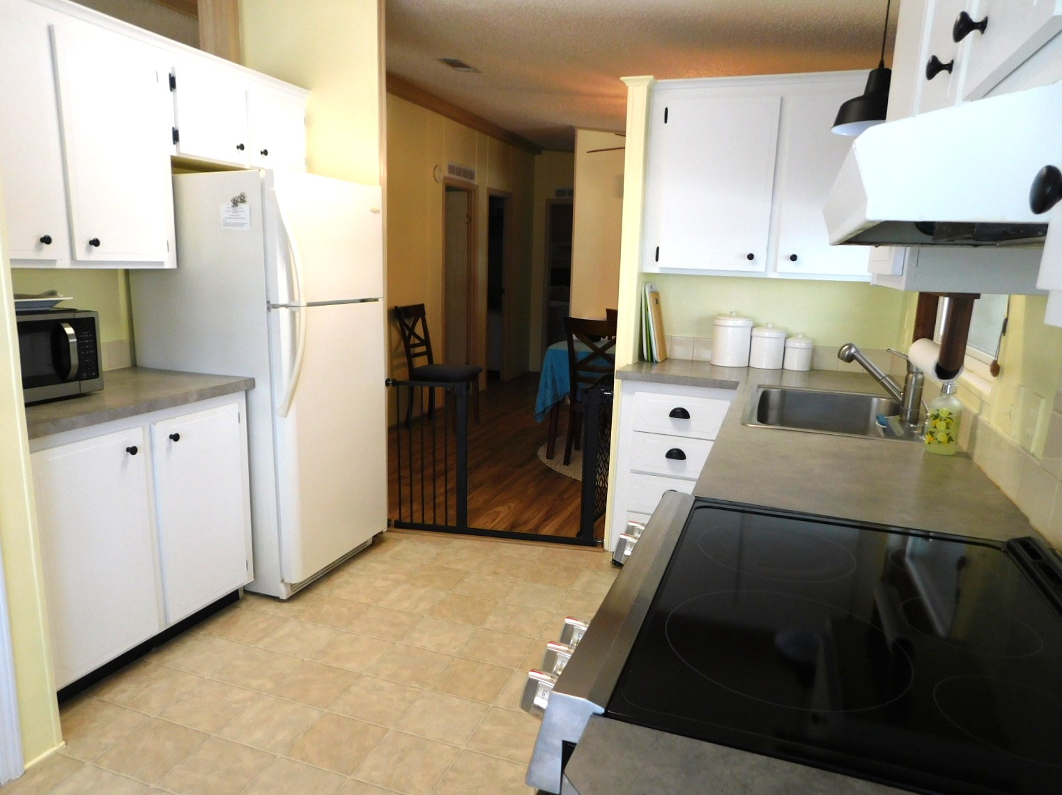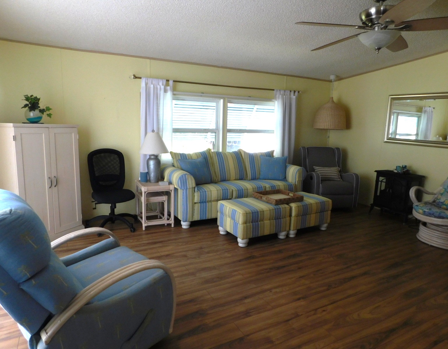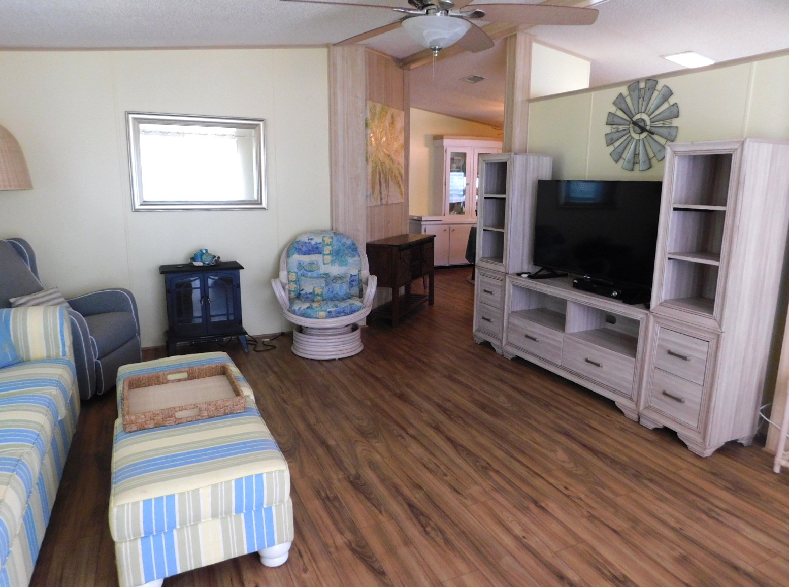 The living room is very spacious. There are sliding glass doors that take you out to the raised, fenced in patio on the front of the home. Great space for morning coffee. As you can see the living room has some very nice furniture and it also comes with a nice sized TV.