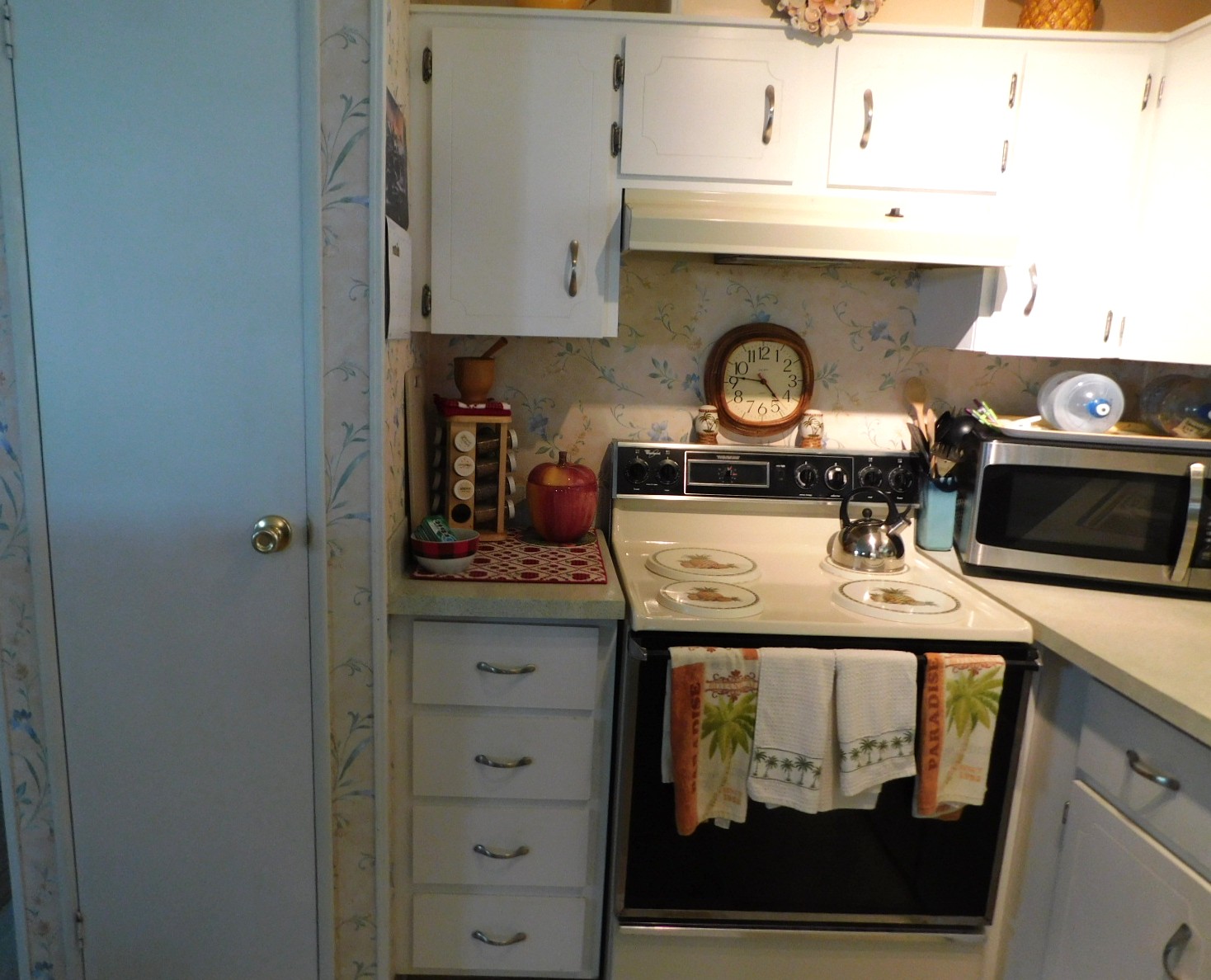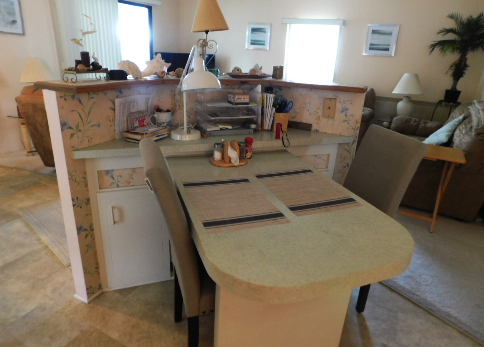 The kitchen is to the right. One of the unique features is the multipurpose island. As you can see in the picture, it has storage, a place to eat, someplace to pay bills. There is a pantry on one end of the L-shaped kitchen and all the appliances you need at your fingertips.