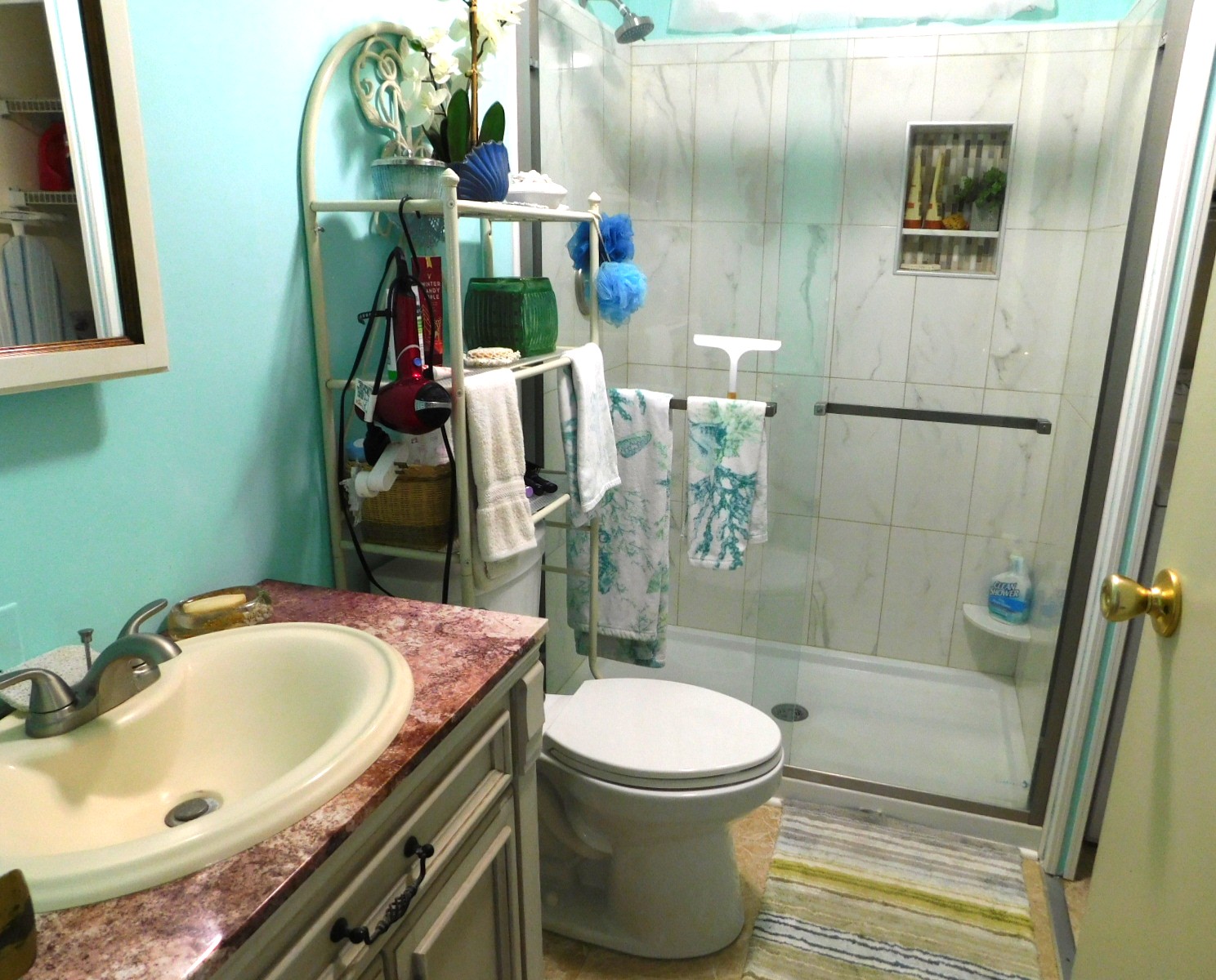 Down the hallway you have the guest bathroom on the right. What is so cool about this bathroom is the newer walk-in shower and it has a very unique space for the washer and dryer. They are tucked in what might have been a closet at one time but now functions as a laundry closet.