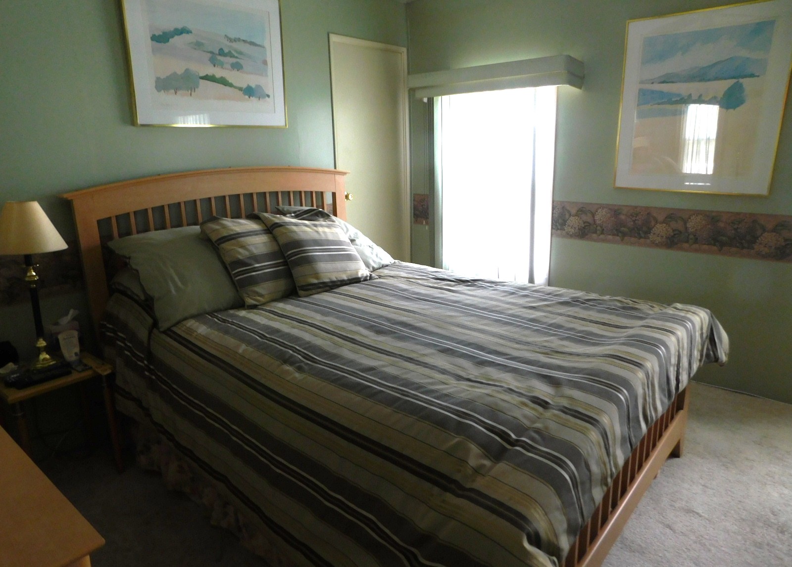 On the left is the guest bedroom. What makes this space special is the angle of one wall where the Queen size bed fits perfectly in. You have plenty of walking space in the room and it is right across the hall to the bathroom This room also has a walk-in closet.