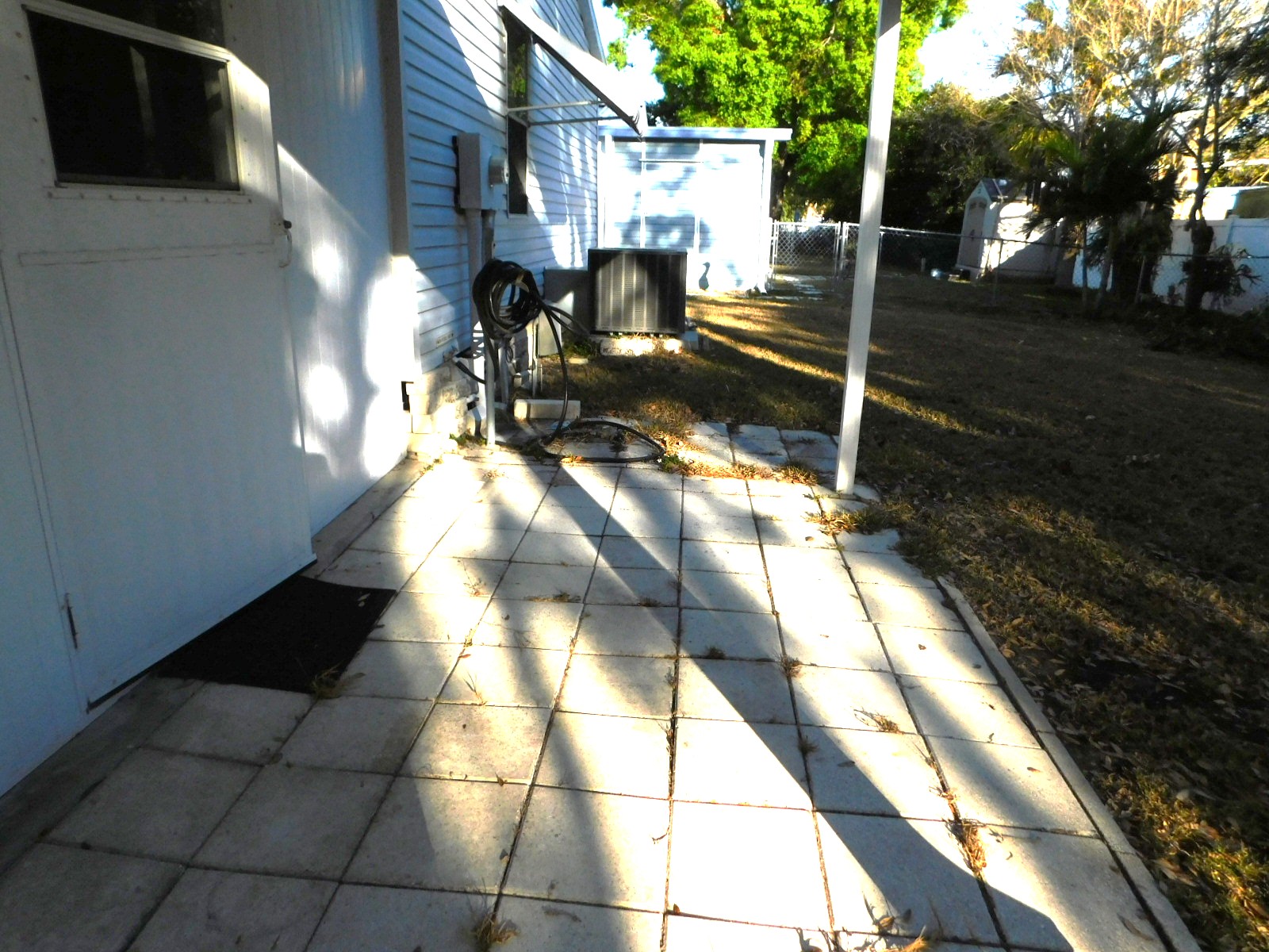 At one end of the carport, you will find the vinyl windowed patio. It can be set up in a relaxing space with access to the house and the backyard. The shed is also part of this space with a back door that opens up to the covered backyard patio and the large backyard.
