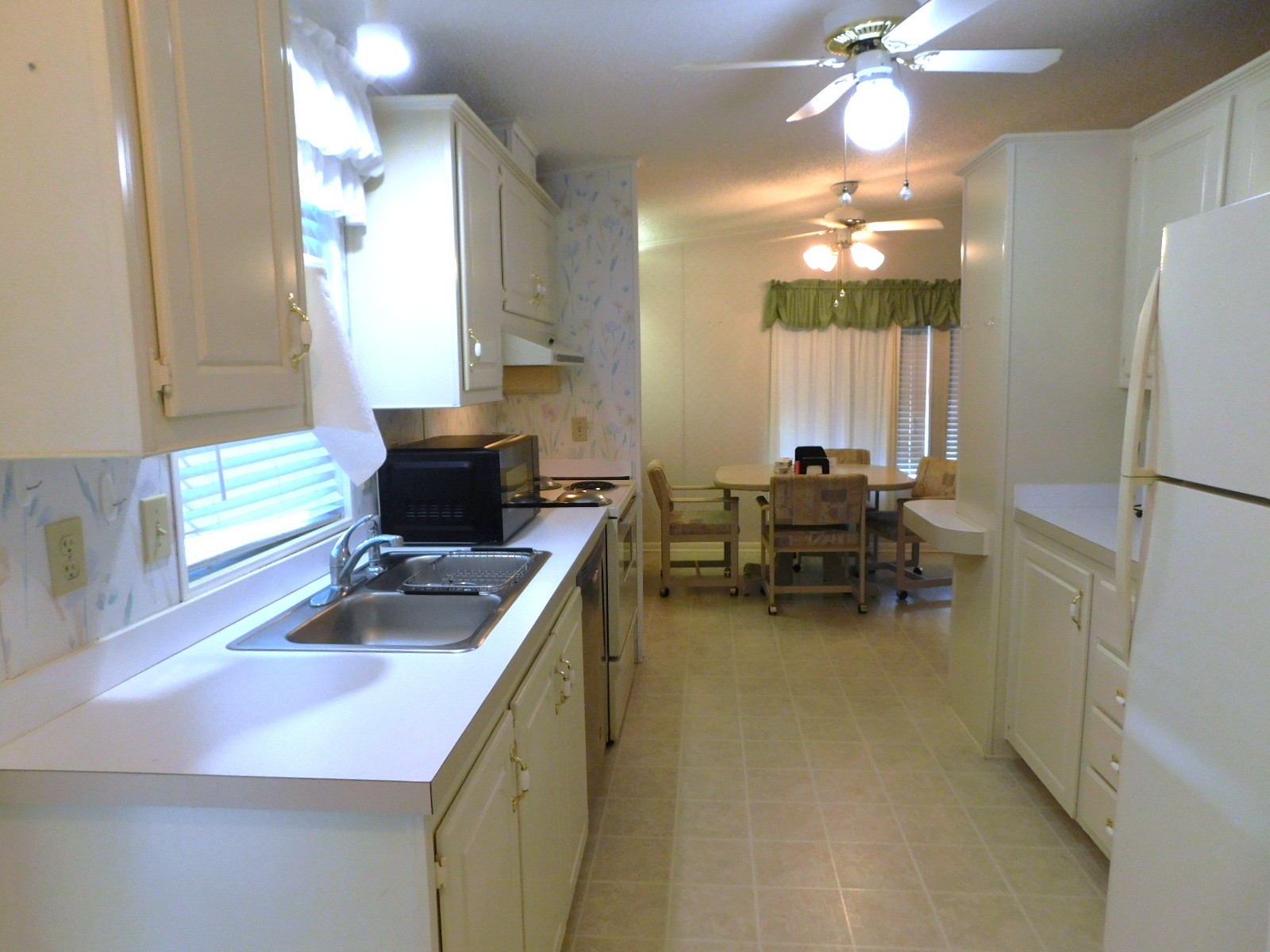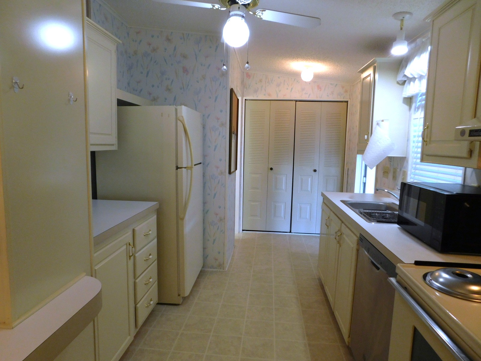 You will be entering into the home through the patio, taking you directly into the galley kitchen. At one end you have the laundry closet, and the other end is the dining room.