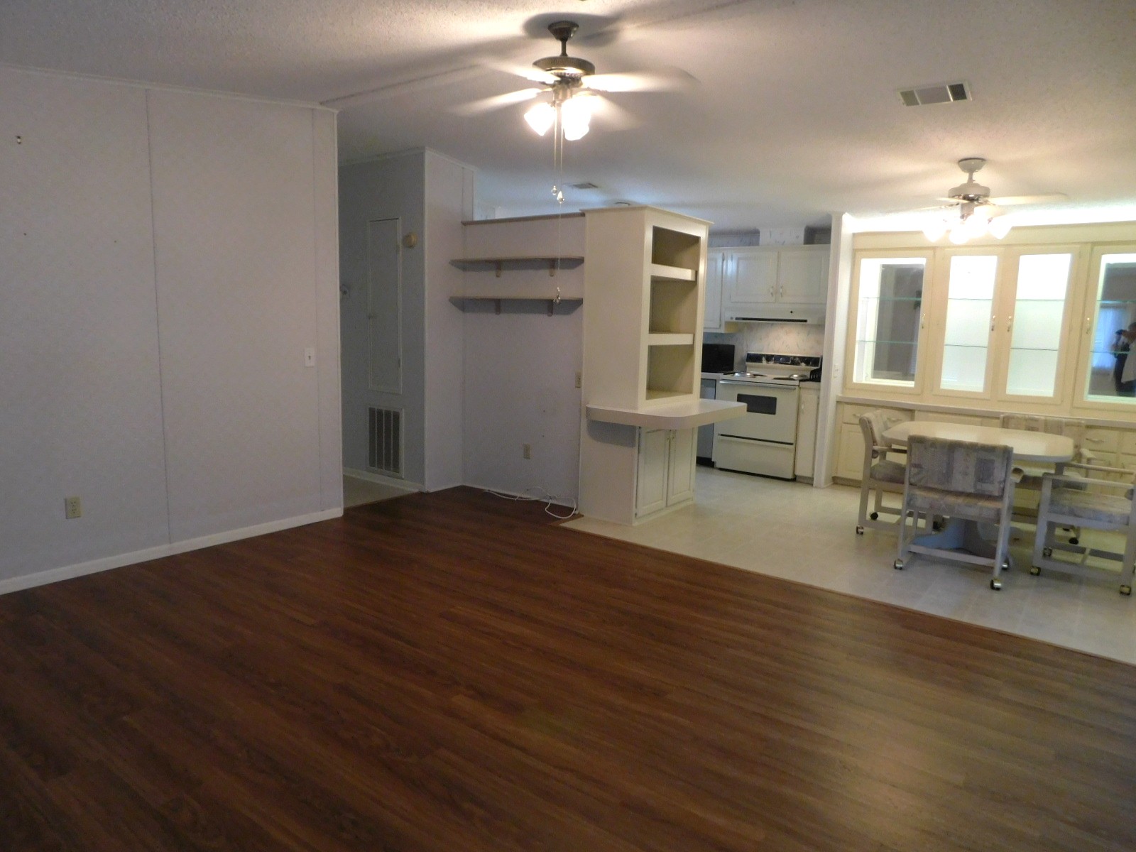 The living and dining area has that open concept feel to it. The dining room is open to the kitchen giving that additional feeling of space. It has a built-in China cabinet with storage below. The home has beautiful flooring in the living room and no carpeting anyway else. It also comes with the dining room table and chairs.