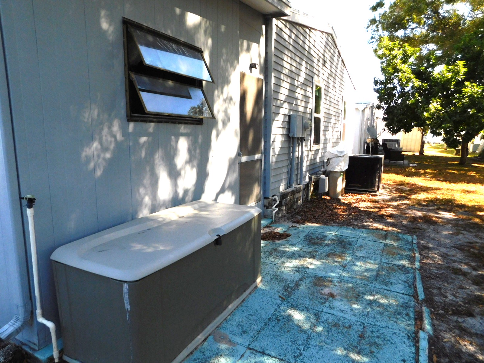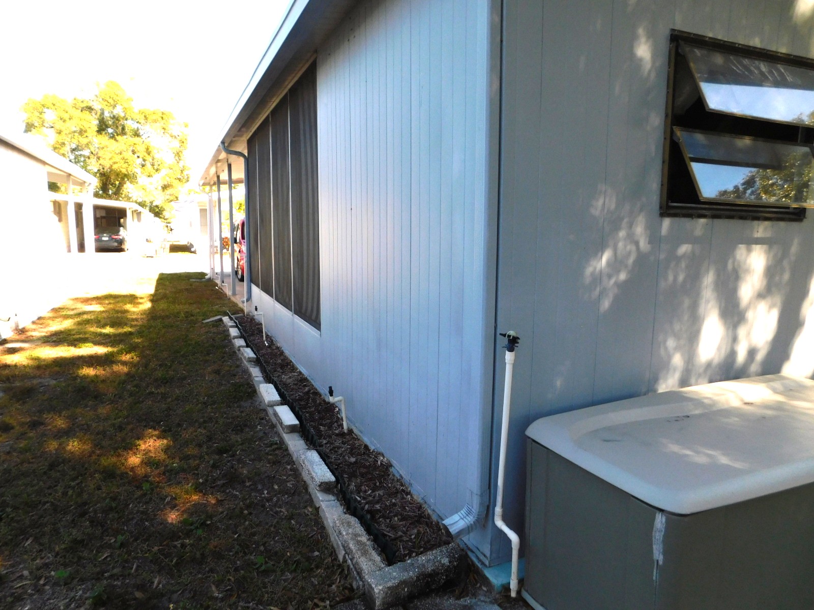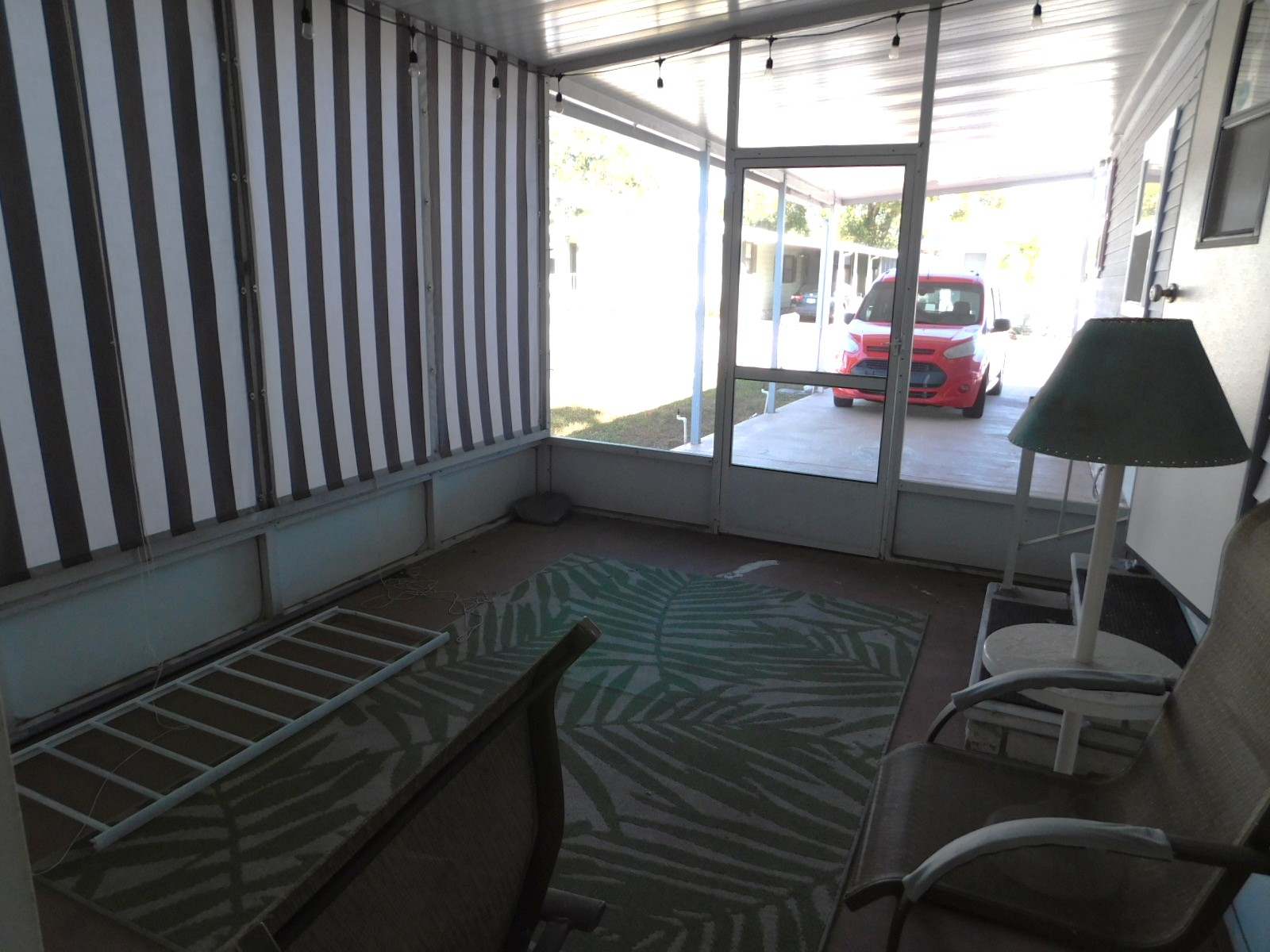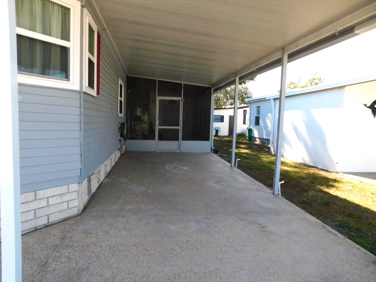 The screened in patio is at the end of the long driveway. It has an attached shed and access to the back patio.