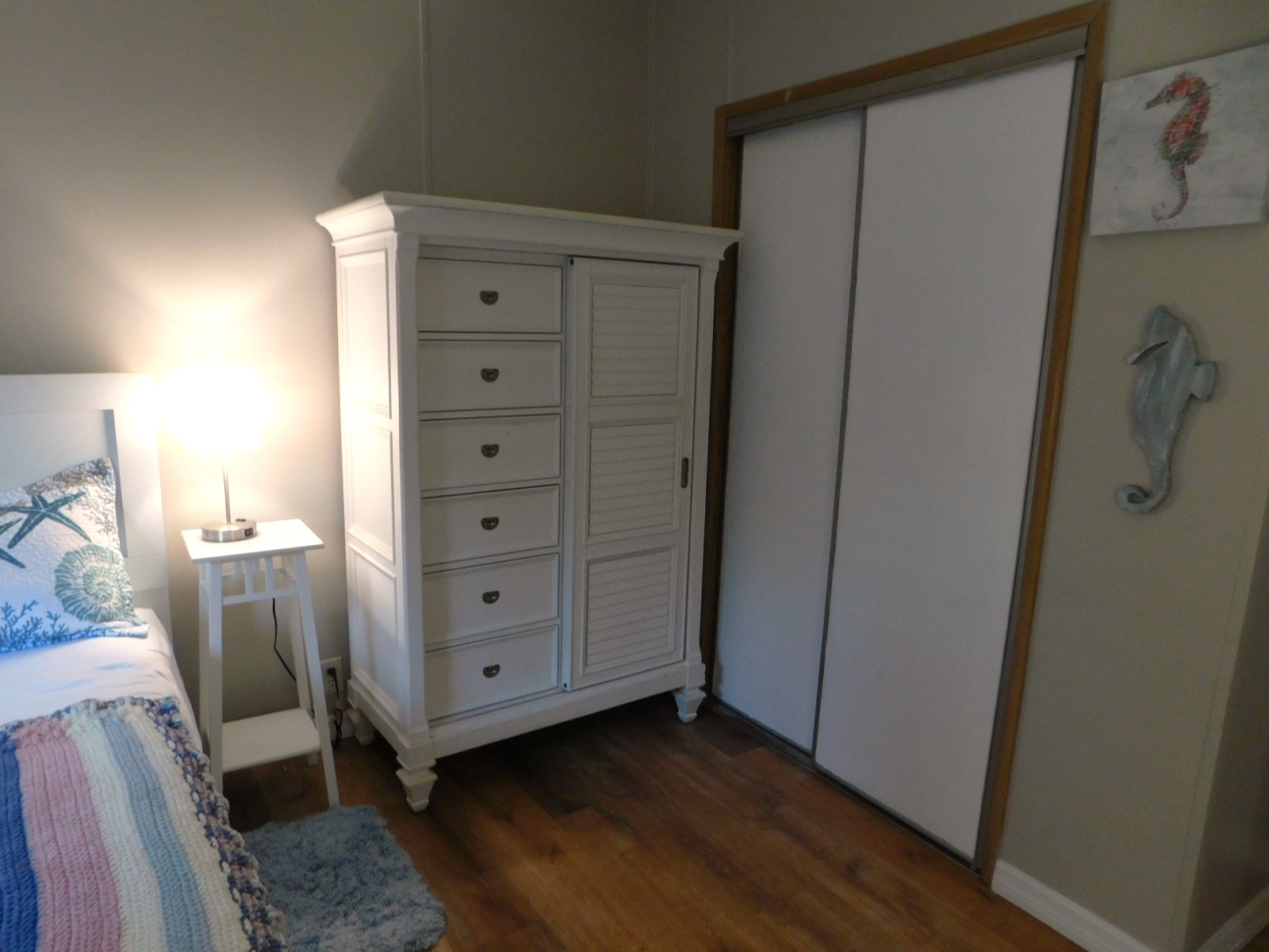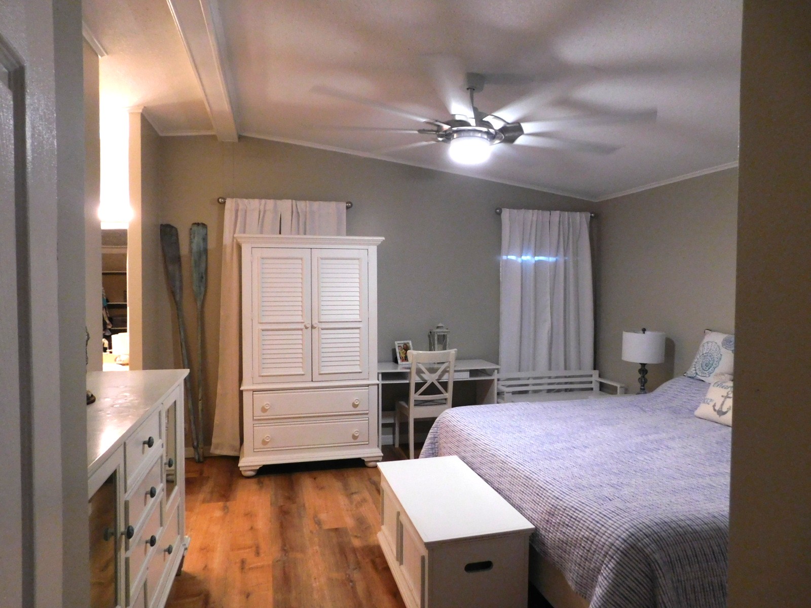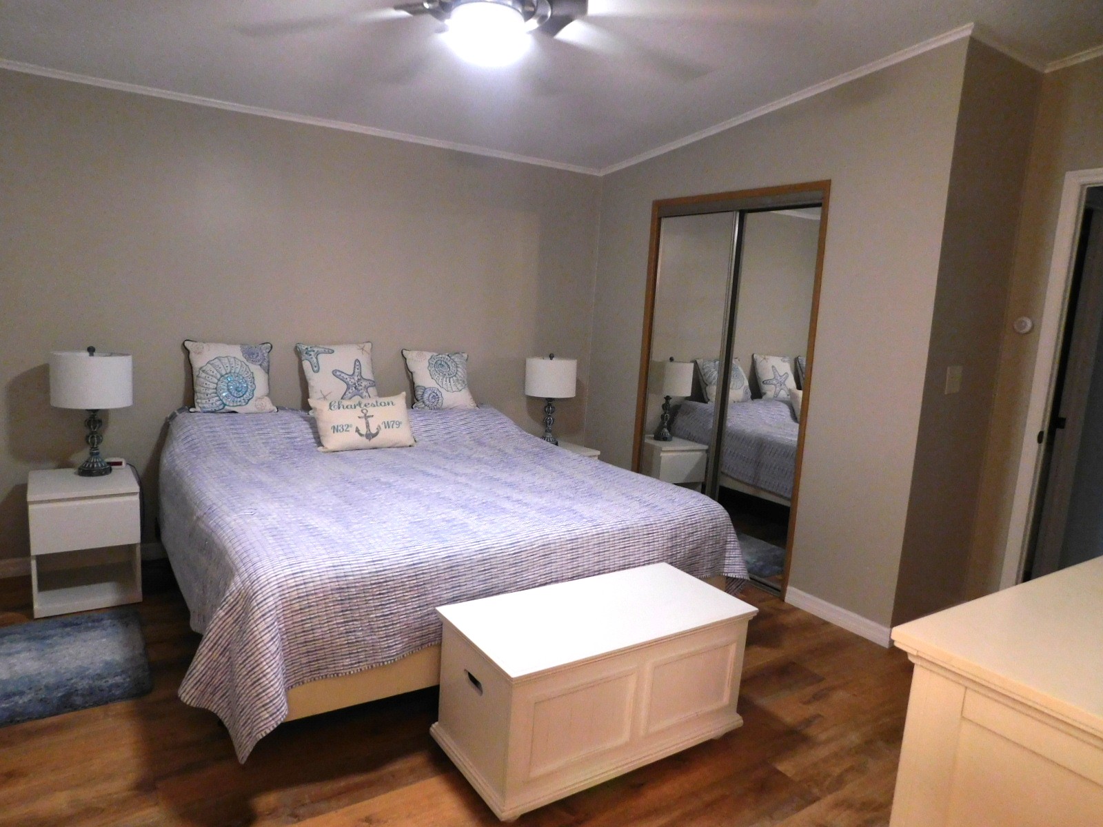 What a great master. This spacious room is large enough to accommodate a king bed set and it has a large extended closet.