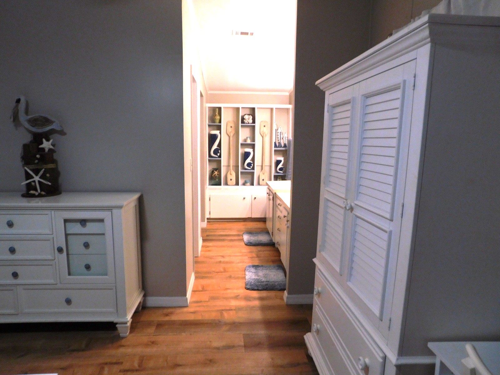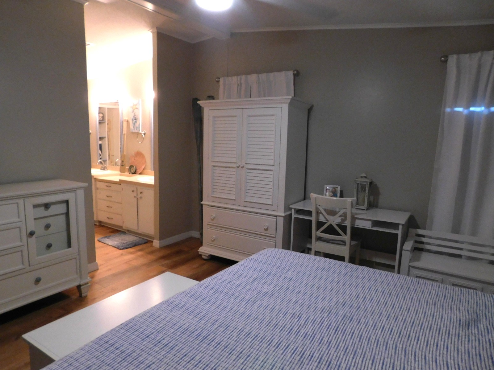 It also has a large walk-in closet, a separate area with double sinks and individual mirrors. As you can see in the picture there is plenty of storage spaces.