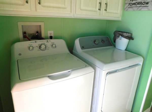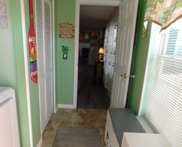 There is a nice seating area on the porch right before you enter the home. Once inside the hallway it has both the laundry area and a large built-in closet.