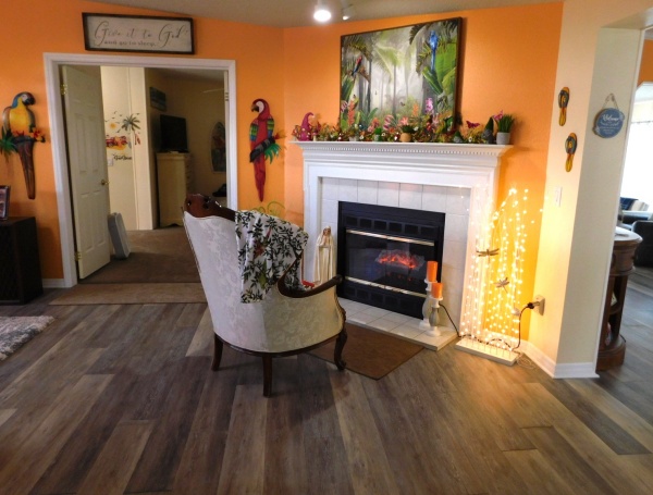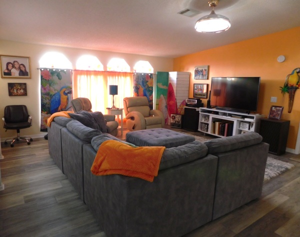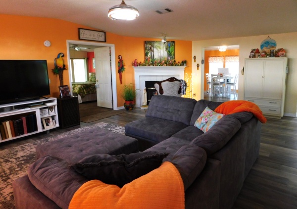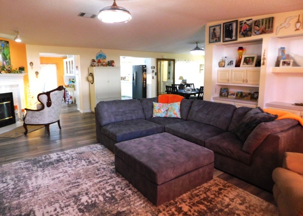 This is a massive space. It has a working fireplace with electric insert**, a wall of windows, a full wall of built-in bookcases and it connects to several other rooms.