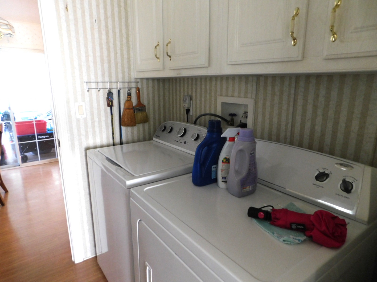 The laundry room also has a built-in utility sink and storage above the washer and dryer.