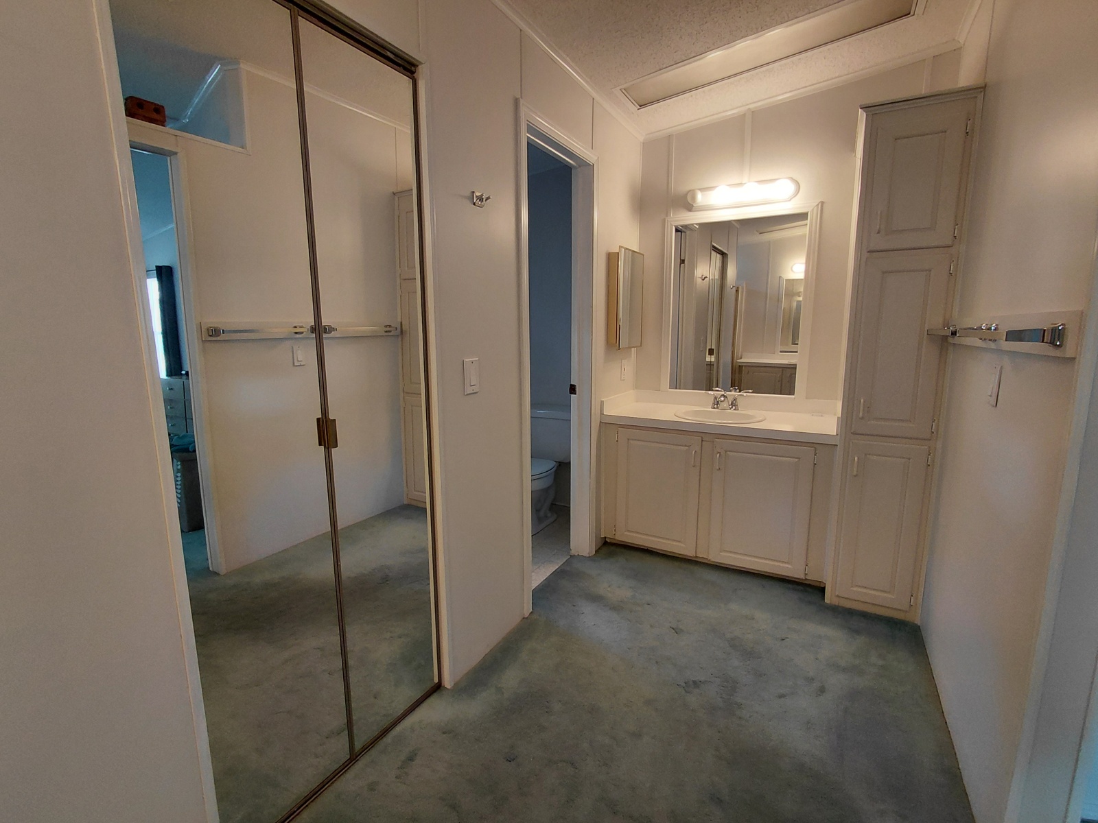 This space not only has a walk-in shower, but it has a large closet centered between the shower and separate water closet. It has two separate vanities with ample cupboard storage space.