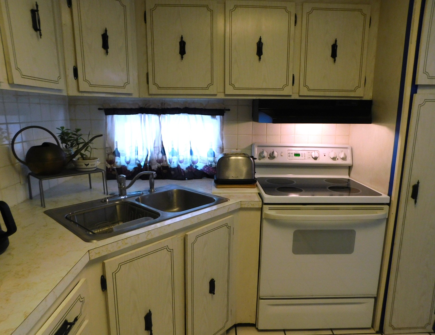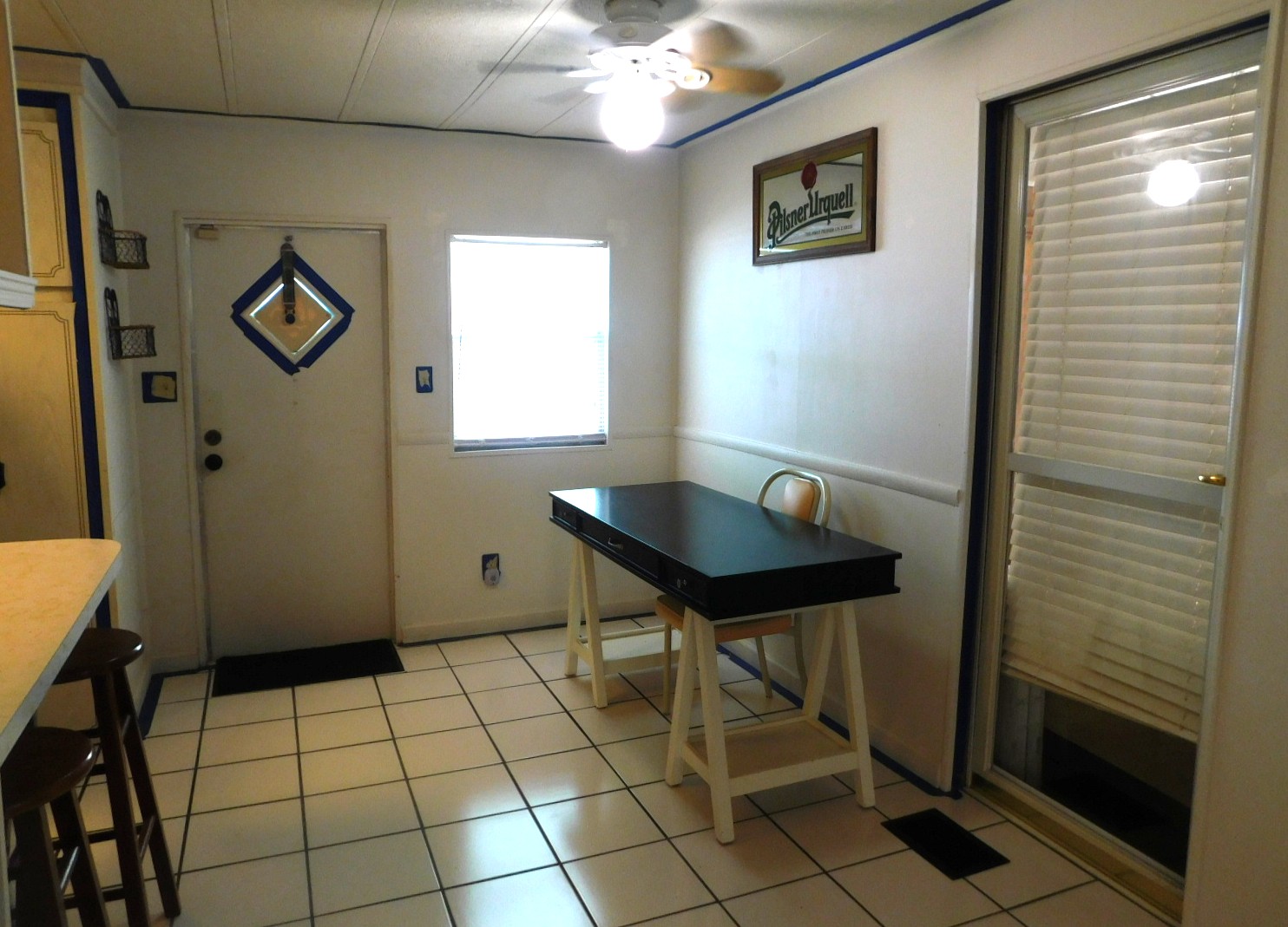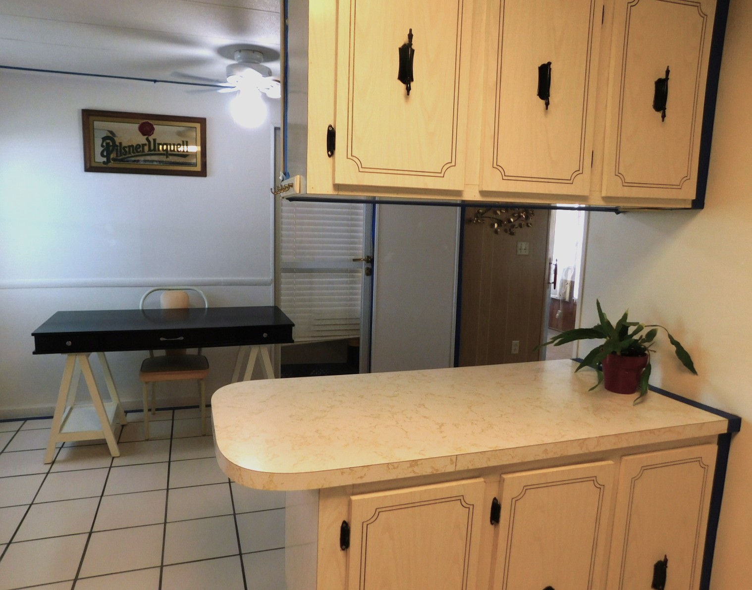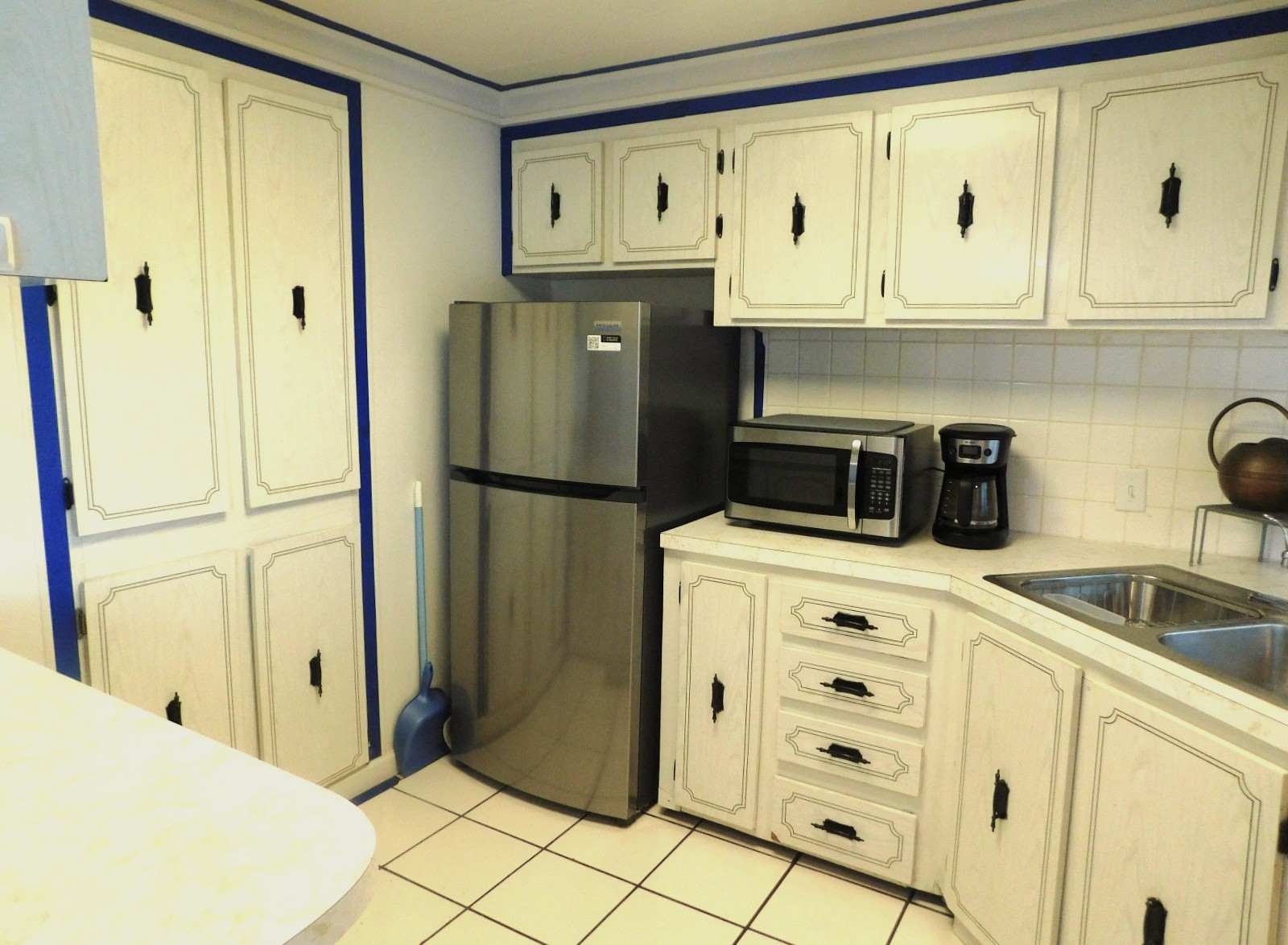 – Kitchen has terrazzo tiled floor, 2 pantries, new stainless refrigerator, plenty of counter space, glass-top range