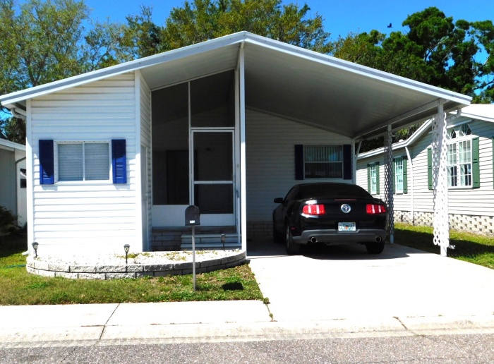 As you can see in the picture the front of the home has a shed and screened-in raised Florida patio on one side and the driveway on the other with the home set back.